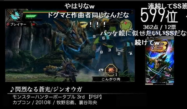 こちらは下がってしまいました、モンスターハンターポータブル3rd「閃烈なる蒼光(牧野忠義、裏谷玲央)」。看板モンスター、雷狼竜ジンオウガのテーマです。エレキギターのうねりが雷を見事に表現。