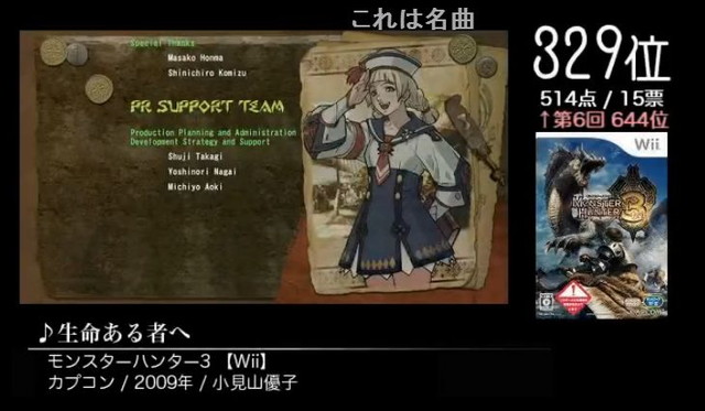 今回のランキングは全体的に見て星のカービィWiiの楽曲はもちろん、カービィ作品がぐんぐん押してきていました。従来のメロディを使用することによる「票の割れやすい曲」でもばっちり高い順位をキープしていました。モンスターハンターはといえば昨年のMH4の発売、今年のMH4Gの発売も含め今後のランキングの変動が気になるところです。