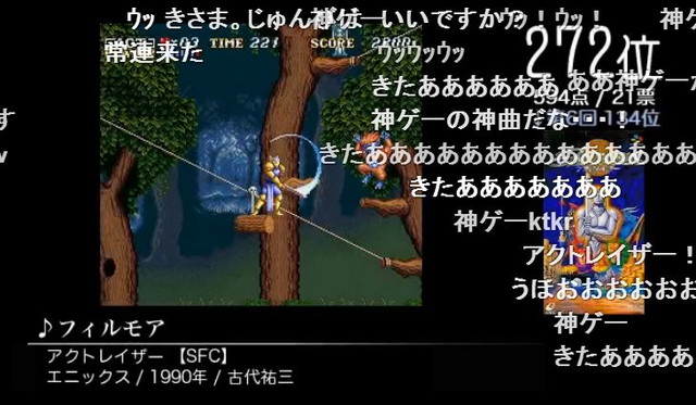 272位、アクトレイザーより「フィルモア(古代祐三)」。神の像を操作し魔物を倒し、エンジェルを操作して人々の世話をする、まさしく神ゲー。意味もなく雷で家を焼き払ったもんです。