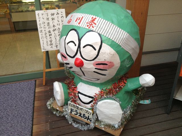 白川茶が有名なようで。白川茶バージョンと称されたドラえもん。(地元の子どもたちがすべて自分の手で仕上げて、神社に奉納した神輿らしい。)