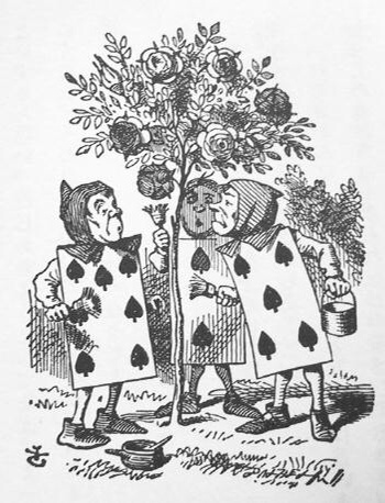赤いバラを植えるはずだったところに、間違えて白いバラを植えてしまったカードの園丁たちは、女王に「首を切られる」のを恐れて、咲いている白い花をペンキで赤く塗っています。『不思議の国のアリス』より
