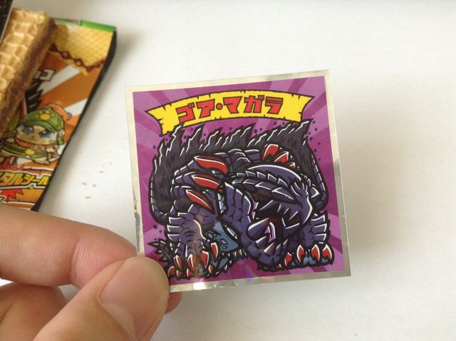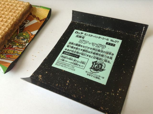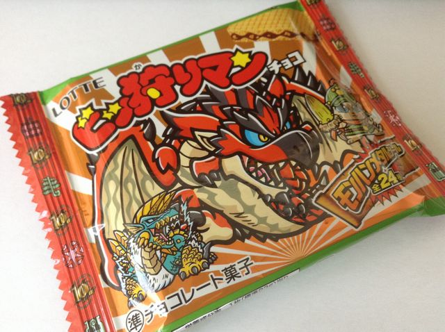その名も「ビッ狩りマン」。ビックリマンとモンスターハンターのコラボ商品。パッケージは写真のリオレウスとゴア・マガラがあるようだ。24種モンハンメタルシールつき、増税の影響か一個108円。(※4月より消費税は8%。)